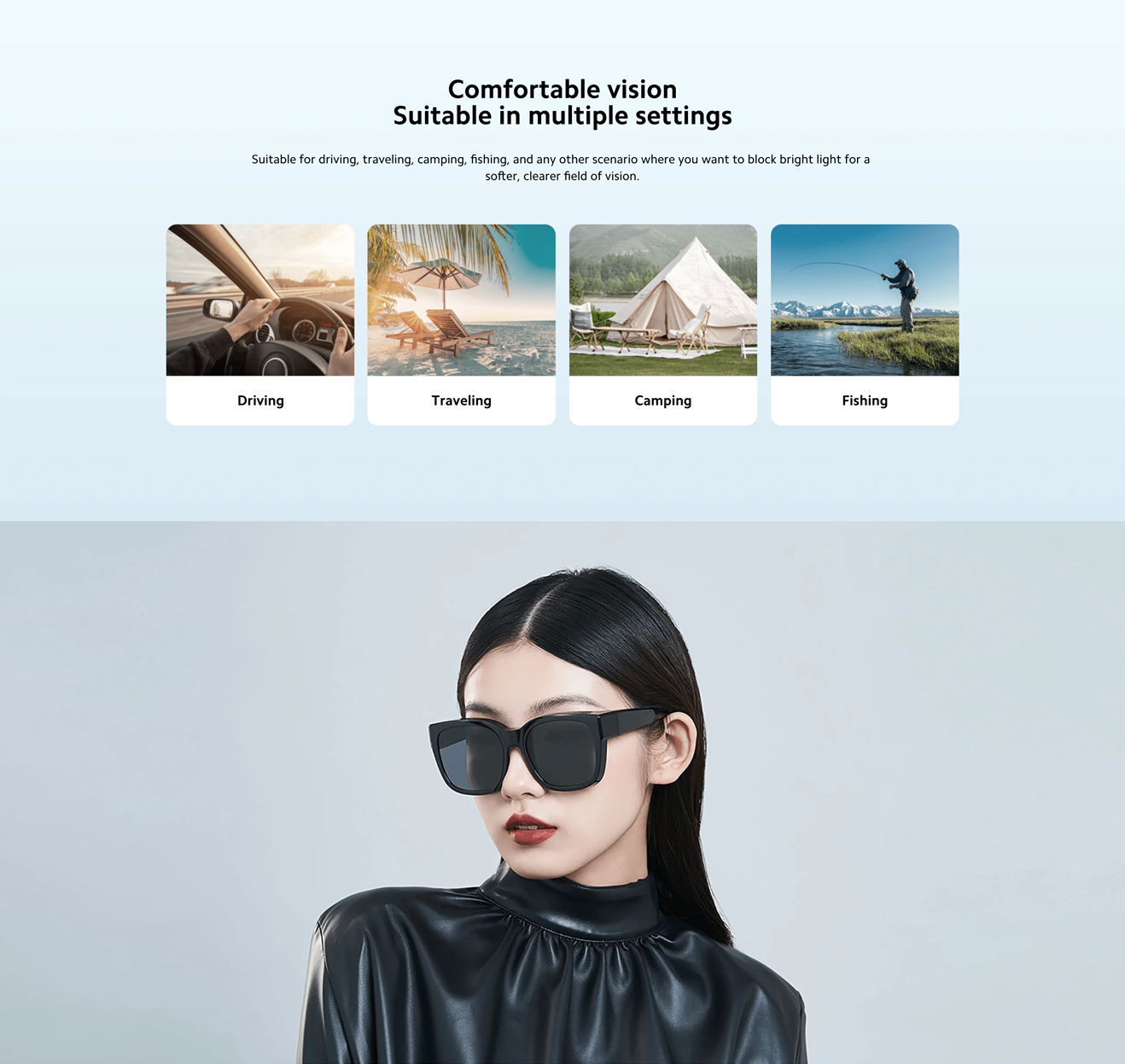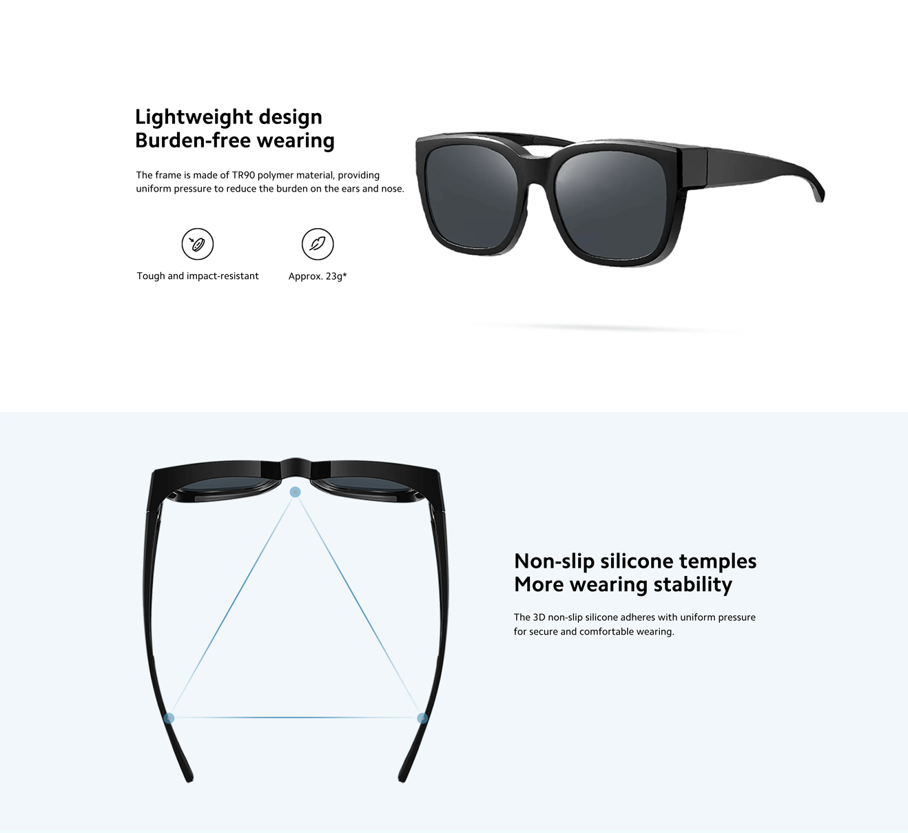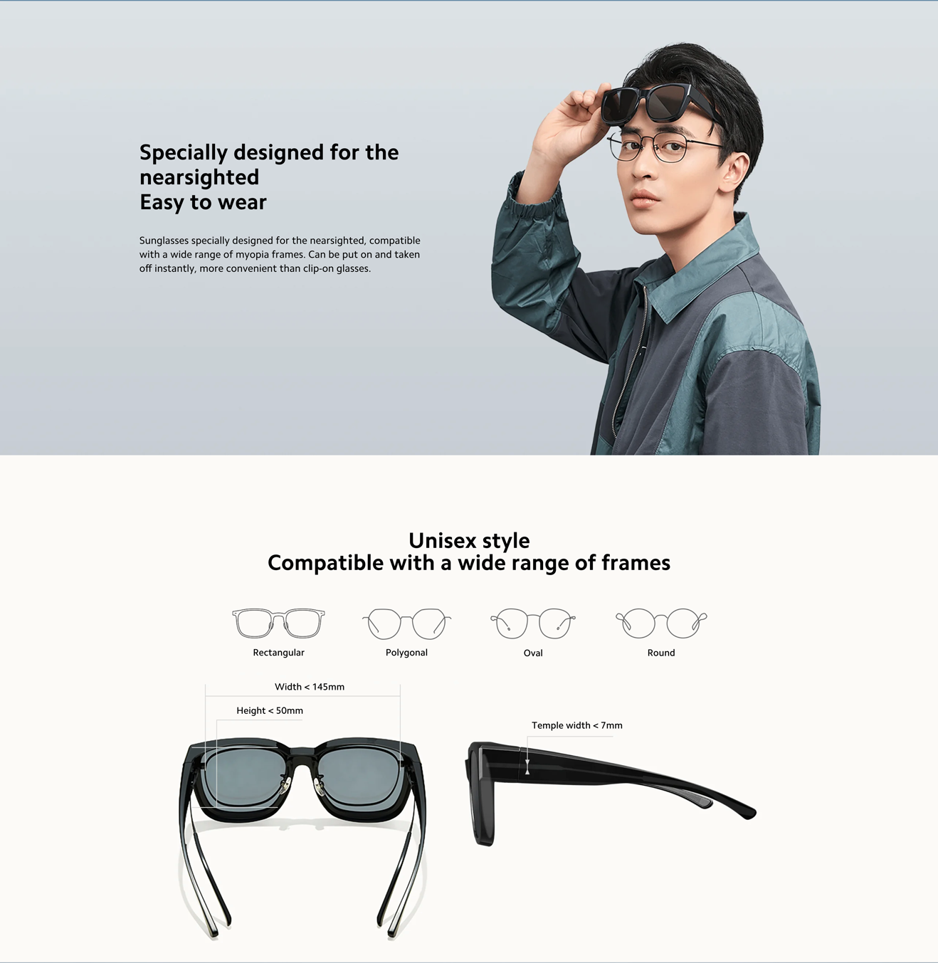 Xiaomi Polarized Fitover Sunglasses – Diellore polaroide të dizajnuara për t’u veshur mbi syzet me dioptri. Me lente gri të polarizuara që ofrojnë mbrojtje UV400 dhe shtresë anti-reflektim OAR për pamje të qartë dhe pa lodhje vizuale. Kuadro TR90 të lehta (~23g), me shina silikoni që sigurojnë përshtatje të rehatshme. Përshtaten me syze me gjerësi deri në 145 mm dhe lartësi deri në 50 mm. Ideale për vozitje, ecje, udhëtime dhe aktivitete në natyrë.