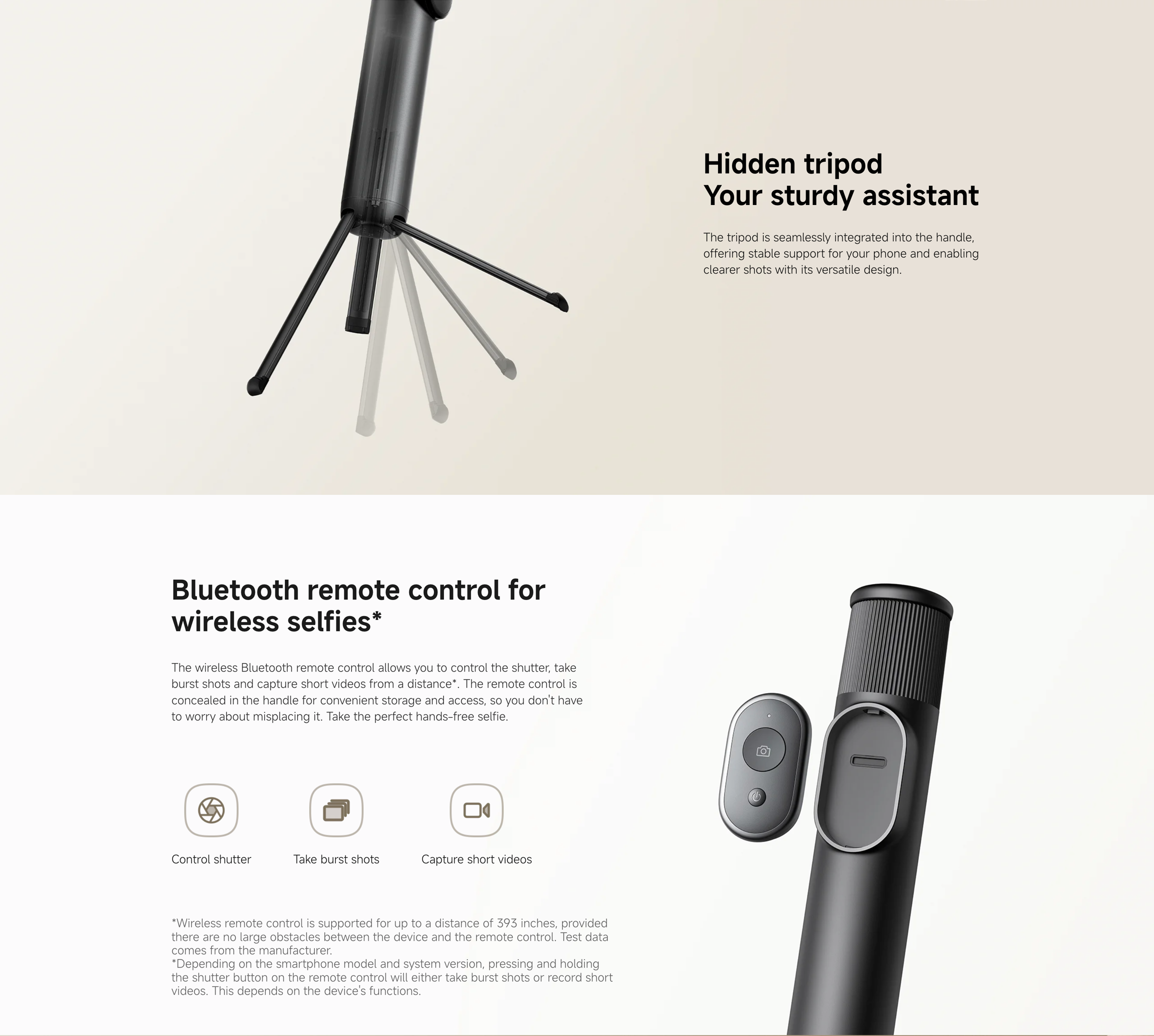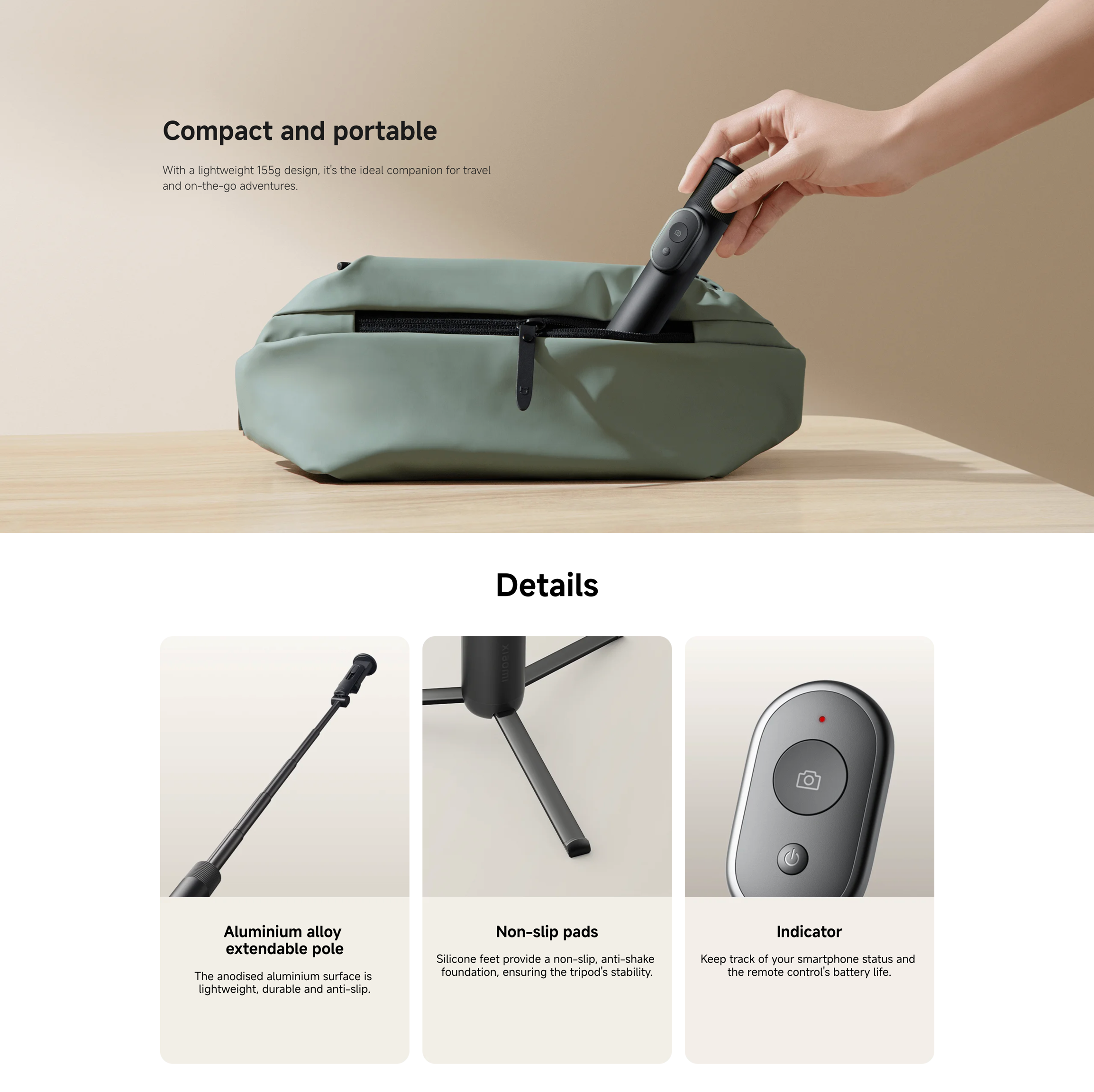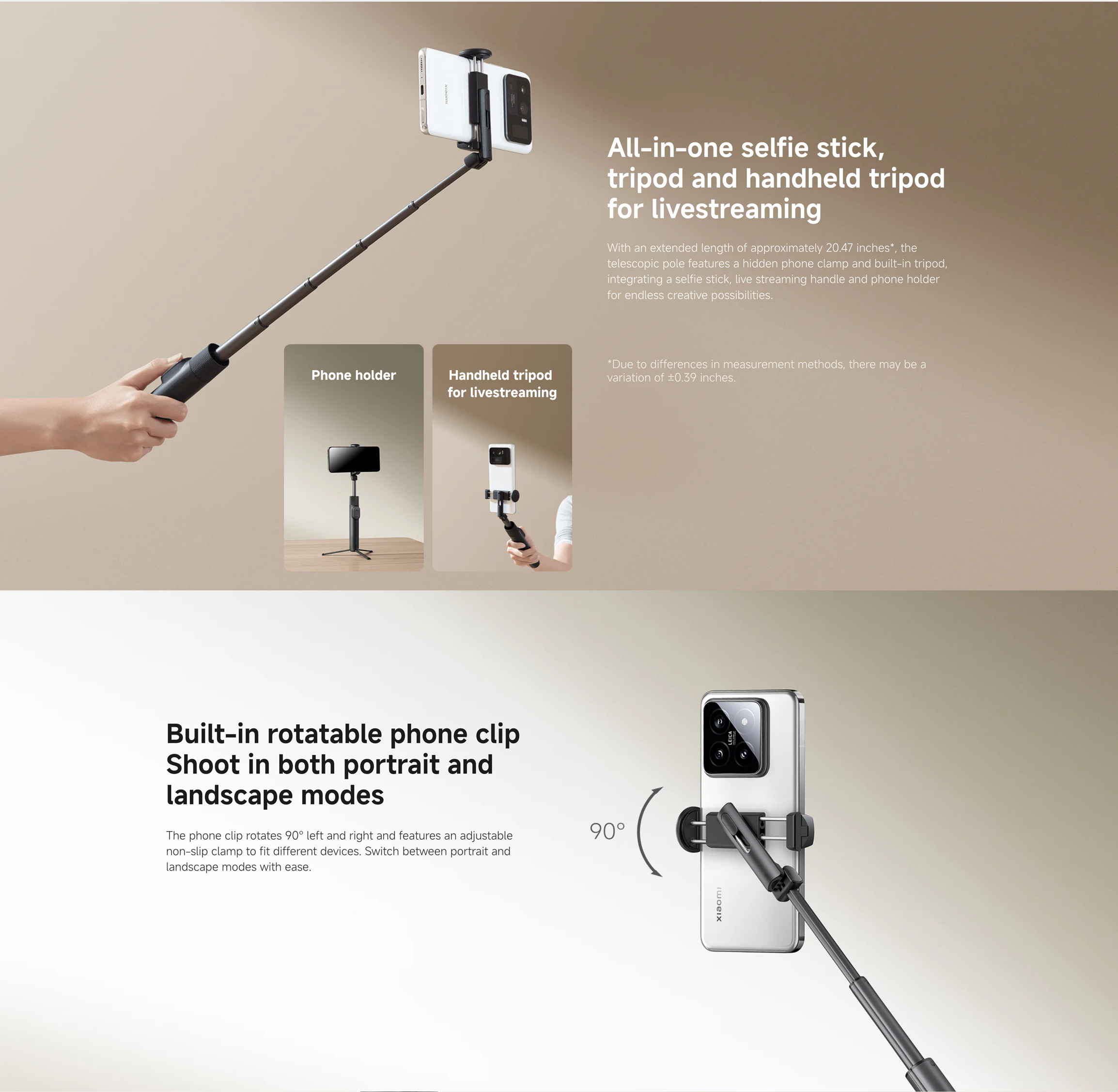 Xiaomi Selfie Stick Tripod Mini – Një aksesor i lehtë dhe praktik që kombinon tre funksione në një: selfie stick, tripod dhe mbajtëse telefoni. Me dizajn kompakt, ndërtim prej alumini dhe telekomandë Bluetooth të integruar, ai ofron stabilitet dhe komoditet maksimal për foto, video dhe transmetime live. Ideale për udhëtime dhe përdorim të përditshëm.