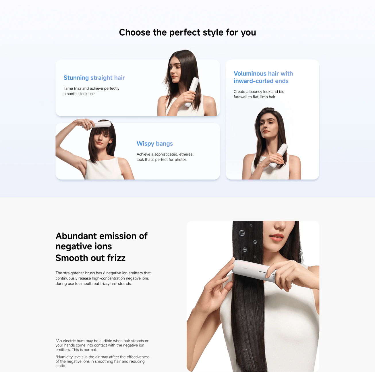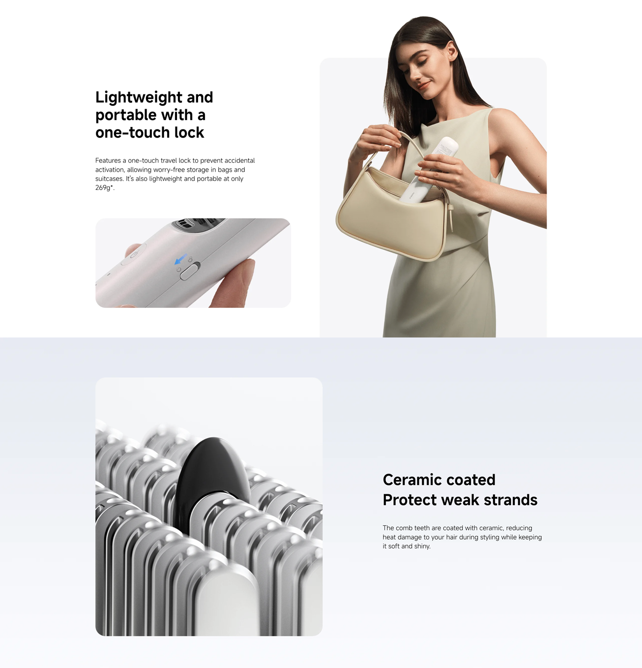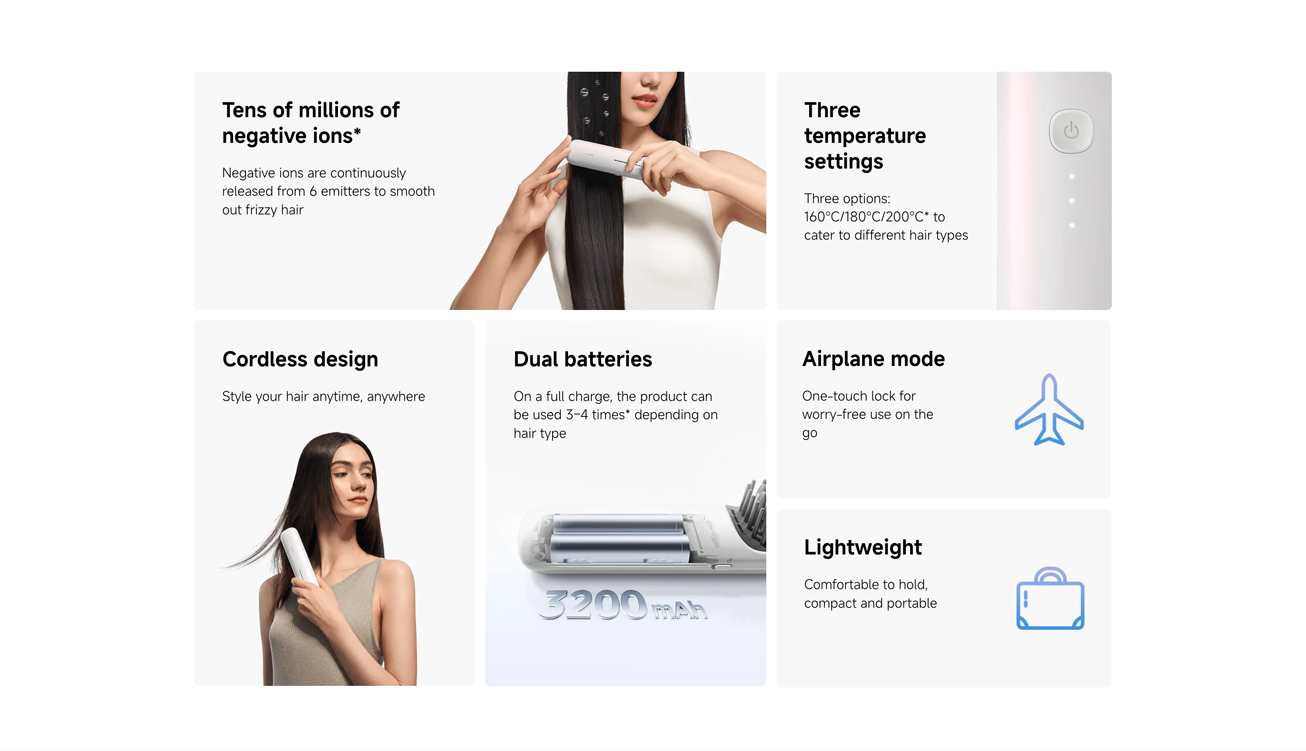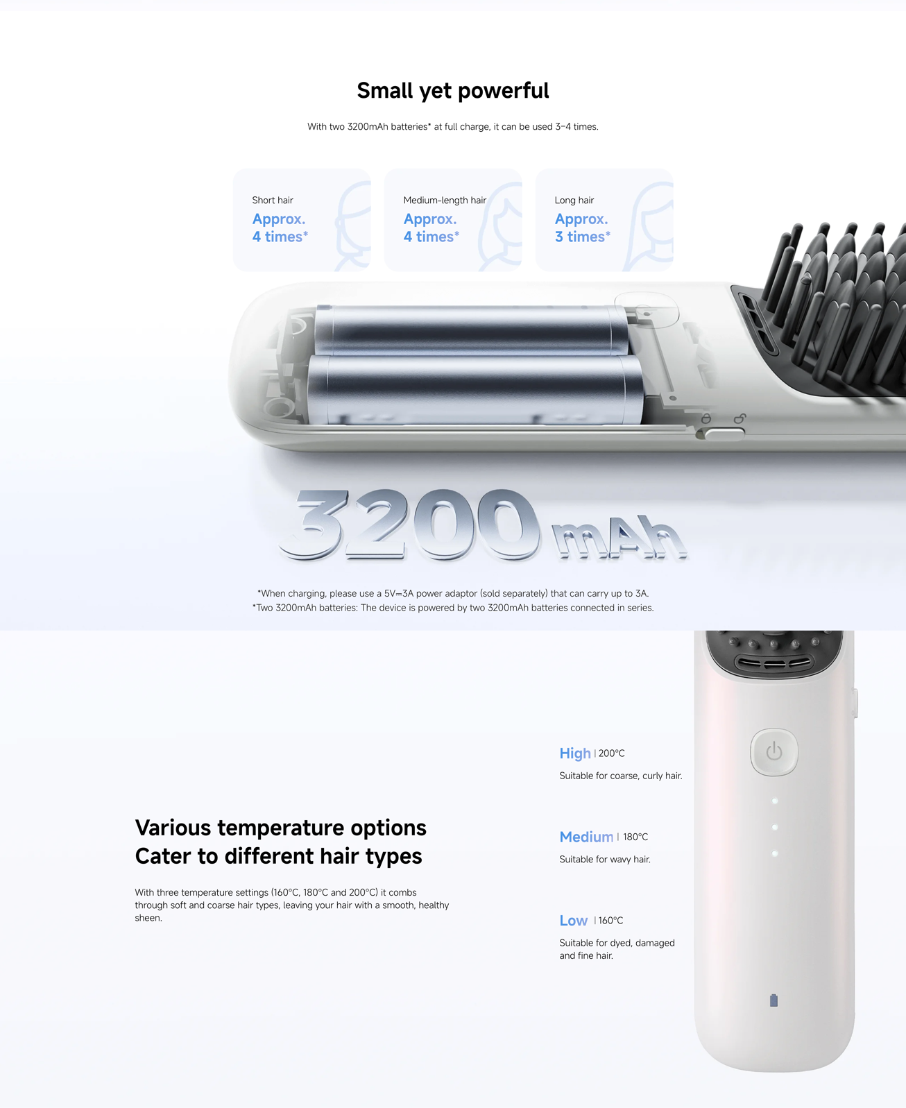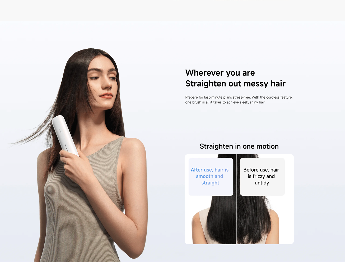Xiaomi Cordless Hair Straightener Brush – Furçë rrafshuese pa kabllo me dizajn kompakt dhe bateri të integruar për përdorim kudo. Ofron ngrohje të shpejtë deri në 200°C dhe tre nivele temperature për stile të ndryshme flokësh. Me shtresë qeramike për mbrojtje dhe shkëlqim, si dhe karikim me USB-C për përdorim të lehtë e praktik.